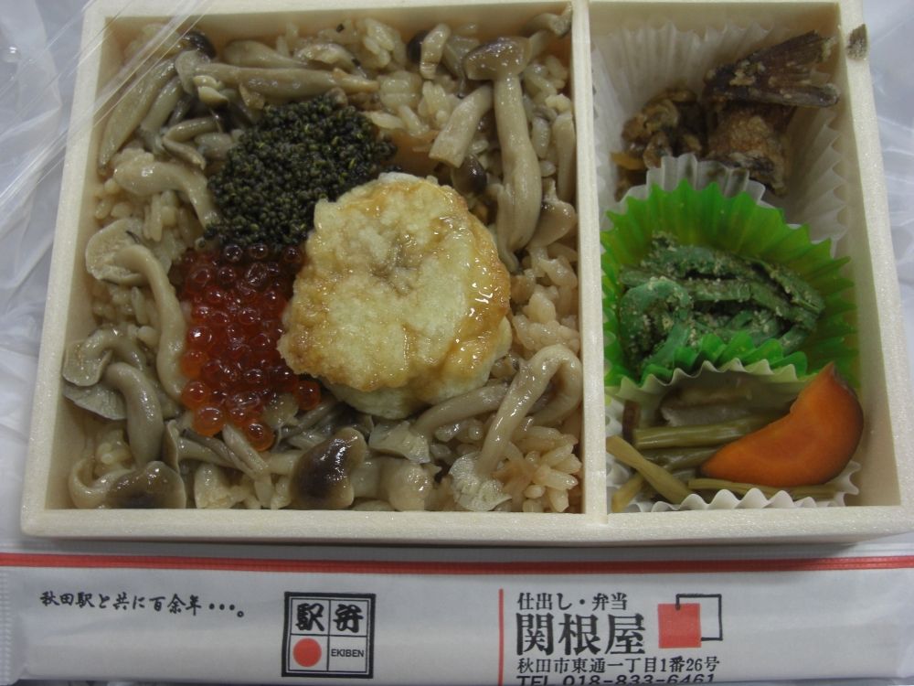 リゾートしらかみくまげら編成の運行開始記念駅弁です。角館駅のNEWDAYSで購入。とんぶり、ブナシメジ、いくら、帆立などを載せ、リゾートしらかみの運行されている秋田と青森両方の名物をイメージしています。