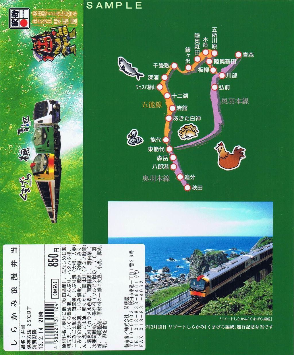 先述のリゾートしらかみくまげら編成運行開始記念駅弁の掛紙がリニューアルされた現行品。新宿駅の駅弁屋で購入。税込850円。