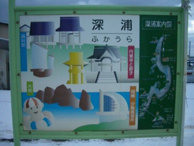 深浦駅舎とホームの観光案内看板。《2009年9月21日撮影》