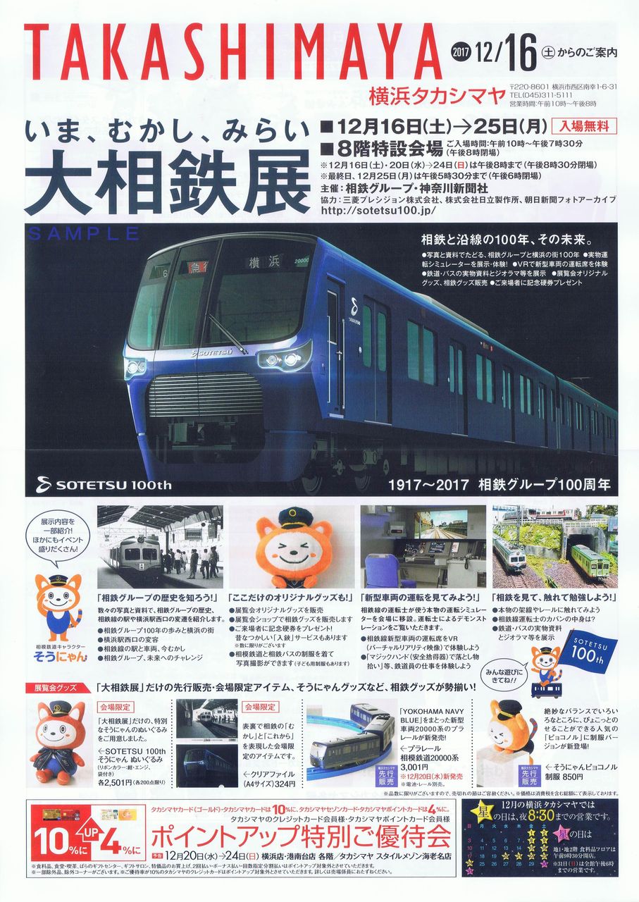 相鉄グループ創立100周年を記念して横浜眦膕8階特設会場にて『いま、むかし、みらい 大相鉄展』が開催されました。同展および高島屋のチラシのデザインは20000系です。