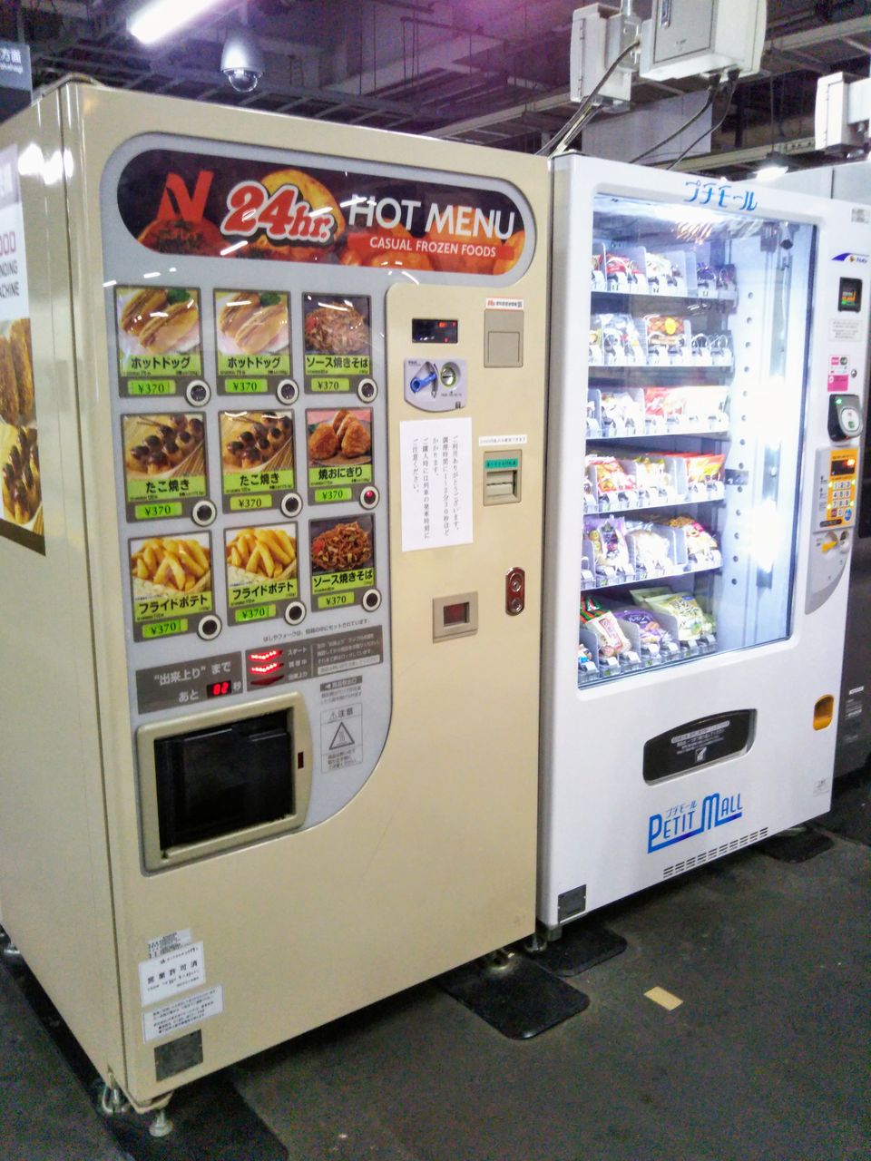 品川駅9・10番ホーム上には、ときわ号に車内販売が無いこと、9・10番ホーム上に売店が無いことを示すポスターが掲示されています。その対策としてか、同ホーム上にはブルボンのお菓子を中心に、おつまみも販売する自販機(プチモール)と、ニチレイの軽食用自販機が設置されています。ニチレイの商品ラインナップは、東武鉄道の特急スペーシア(JR直通特急など一部を除く)のビュッフェで販売されているものに近いようです。自販機には調理時間が1分〜3分30秒で、発車時間に注意するよう記されています。