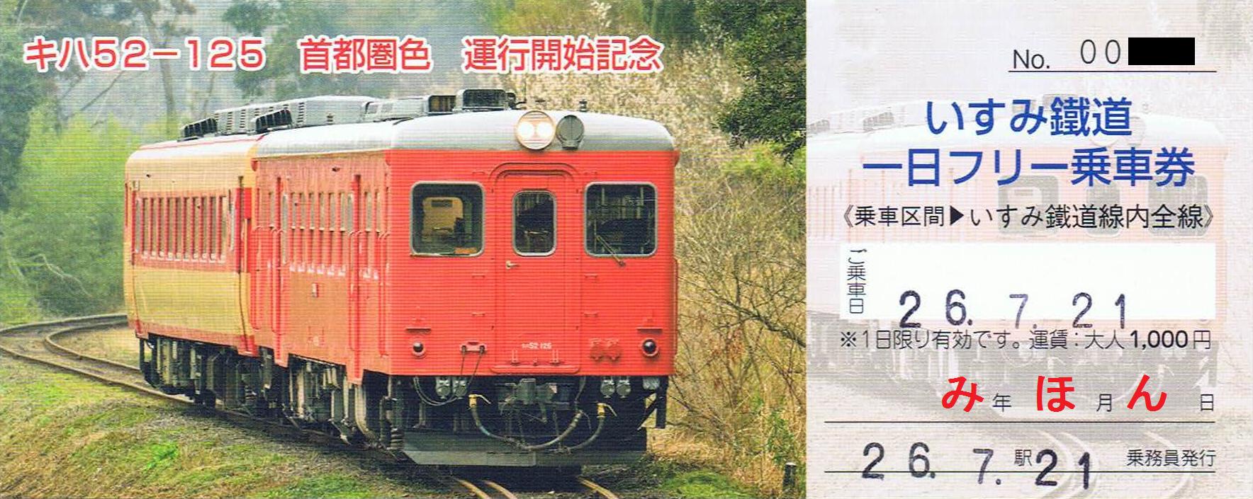 平成26年発売の『キハ52-125首都圏色運行開始記念1日フリー乗車券』から『運行開始記念』の文字が取れたバージョン。大原駅売店で購入しました。