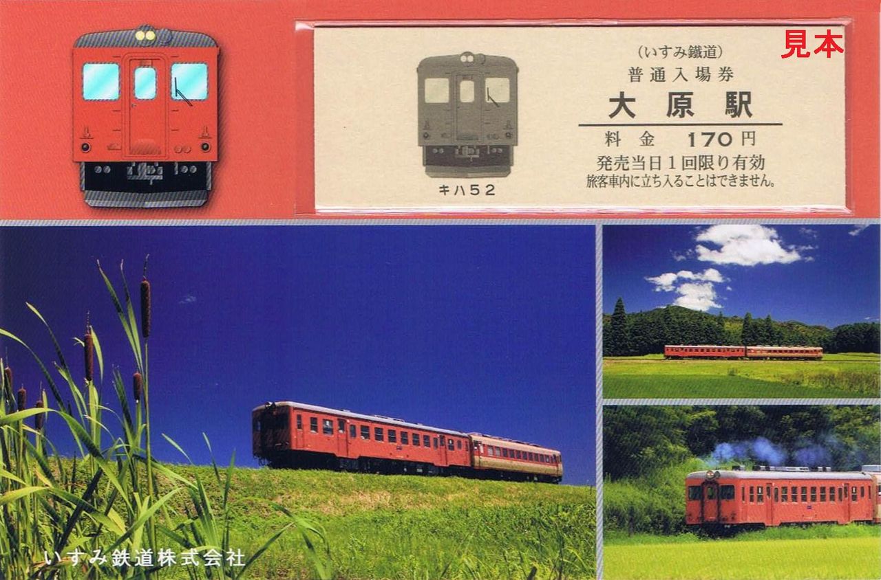 平成28年の夏に登場した新デザインの硬券入場券のうち、キハ52-125首都圏色デザインのものは大原駅の入場券です。