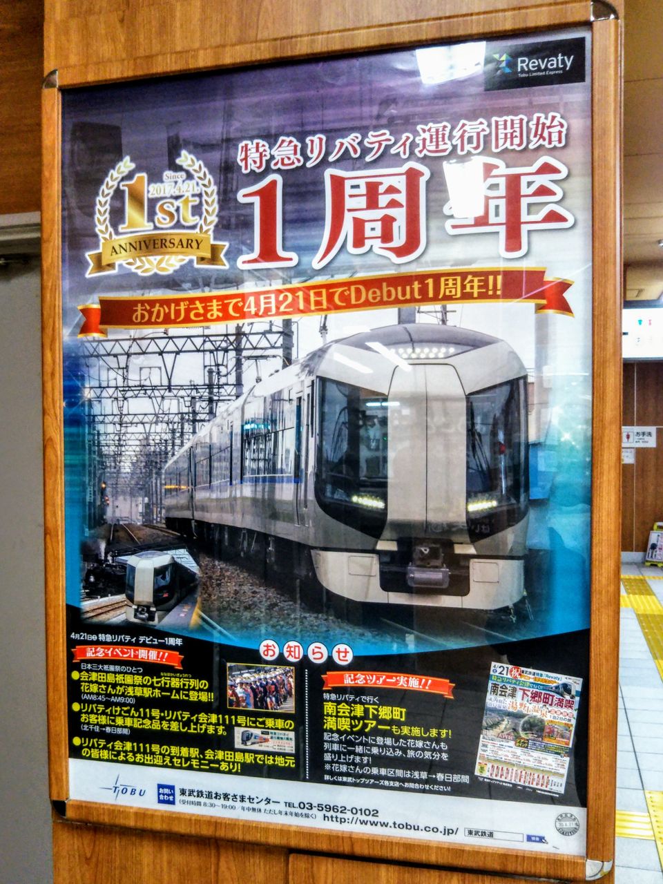 鬼怒川温泉駅に掲示されていたリバティ1周年記念ポスター。同駅ではリバティ運行開始1周年関連ではなく、本物の出会い栃木DC関連のおもてなしとして、列車到着時に冷たいお茶と団子のおもてなしがありました。【関連記事】