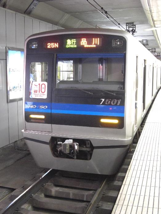 平成20年11月に同駅が開業10周年を迎えましたが、乗り入れしている北総鉄道7500形にも直通運転開始10周年記念ヘッドマークが掲出されていました。急行・品川行。