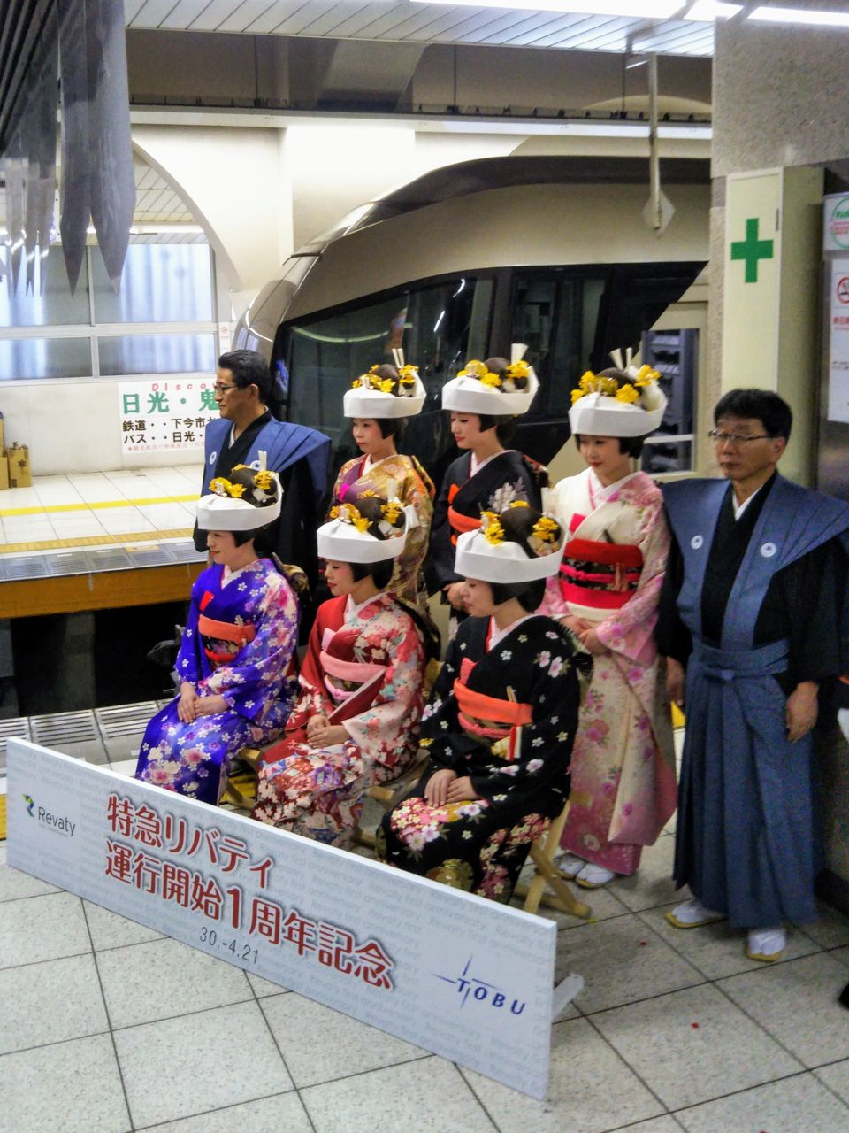浅草駅1階窓口ではリバティ運行開始1周年記念入場券セットを求める鉄道マニアが多数。ホーム上では発車前に会津田島祇園祭の花嫁行列イベントを開催。花嫁さん達はそのままリバティ運行開始1周年記念号に乗車しました。