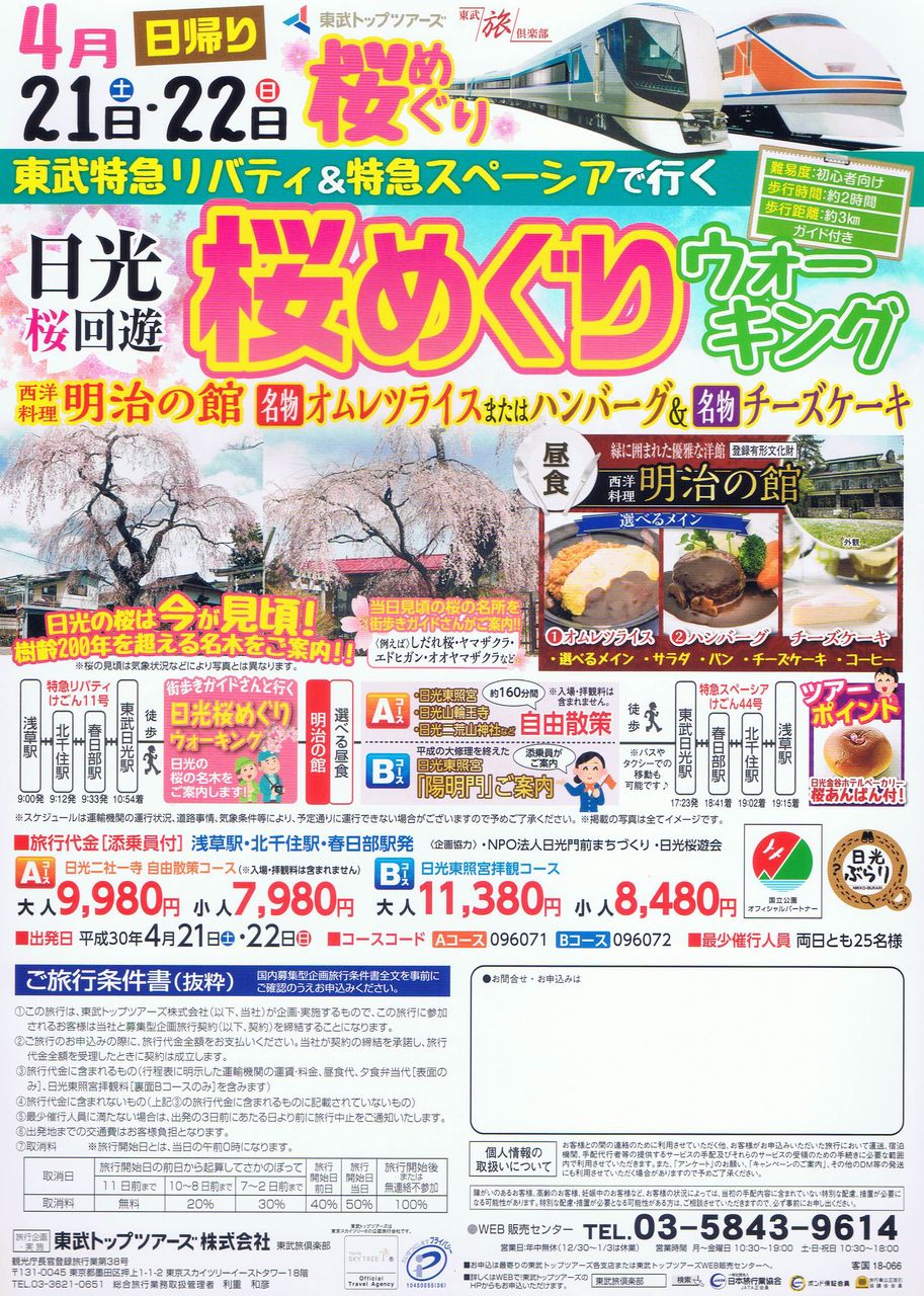 写真右はリバティけごん11号(21日の往路はリバティ運行開始1周年記念号)利用・日帰りの『日光桜回遊桜めぐりウォーキング』ツアーパンフレットです。