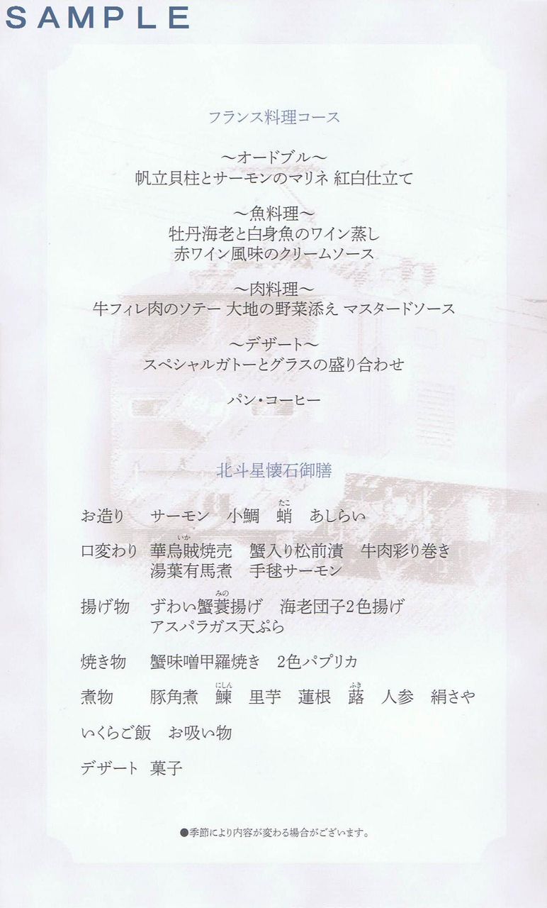 ¡¡Æâ¦º¸ÊǤˤÏξ¥³¡¼¥¹¤Î¤ªÉʽñ¤¡£¤Ê¤ª¡¢²¼Éô¤Ë¤Ï¡Ø¡üµ¨Àá¤Ë¤è¤êÆâÍÆ¤¬ÊѤï¤ë¾ì¹ç¤¬¤´¤¶¤¤¤Þ¤¹¡£¡Ù¤È¤ÎµºÜ¤¬¤¢¤ê¡¢¤¢¤ëÄøÅÙÈÆÍÑÀ¤Î¤¢¤ëµºÜÆâÍÆ¤È¤Ê¤Ã¤Æ¤¤¤Þ¤¹¡£¡¡Æâ¦±¦ÊǤÏËÌÅÍÀ±¹æ¡¢¥«¥·¥ª¥Ú¥¢¹æ¤Î¿©Æ²¼Ö¤ÎÎò»Ë¤Ë¤Ä¤¤¤ÆµºÜ¡£Åö³º¥³¡¼¥¹ÎÁÍý¤ò¿©¤Ù¤¿¿Í¤Ï»ý¤Áµ¢¤Ã¤Æ¡¢¾è¼ÖµÇ°ÉʤȤʤëÍͤʤĤ¯¤ê¤Ë¤Ê¤Ã¤Æ¤¤¤Þ¤¹¡£