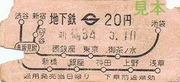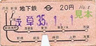 20円。地図式。表面に発行箇所と発行日を示すスタンプが押されています。裏面には4桁の券番が印刷されています。《軟券乗車券(浅草駅・昭和35年1月1日)》