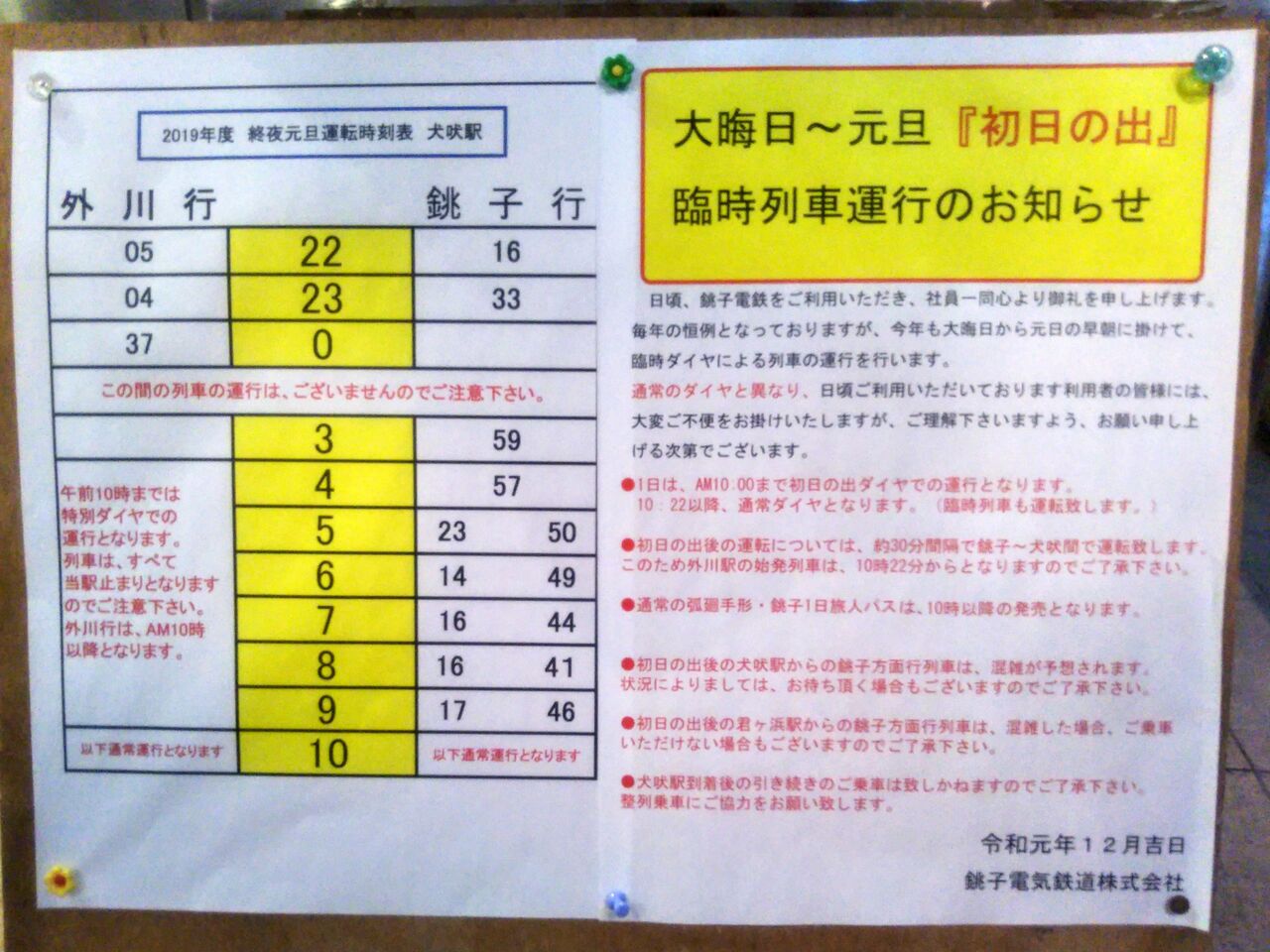 犬吠駅に掲出された大晦日から元旦にかけての「初日の出」臨時列車の時刻表と、初日の出時刻。