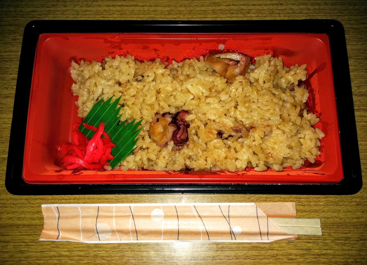 増毛駅構内で営業している孝子屋ぐるめ食品の直売店で販売しているたこ飯。税込500円。