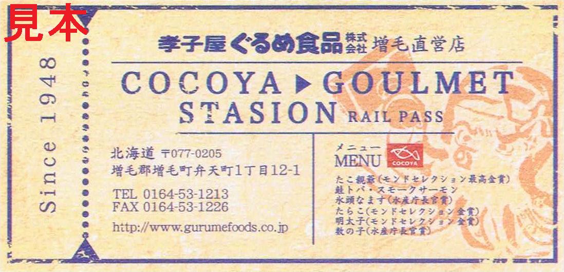 店の案内が書かれたD型と定期券の中間サイズくらいの紙が配布されていました。『GOULMET STASION RAIL PASS』(記載されているスペル通り)のタイトルから、切符を意識した様式のようです。《留萌駅 旭川駅立売商会 にしんおやこ(2017年1月12日購入)》