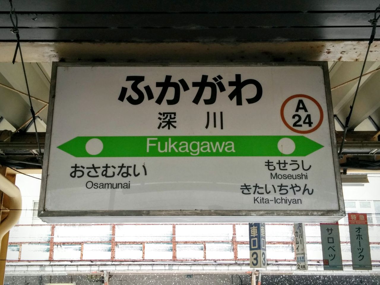 深川駅4番ホームの駅名標です。函館本線と留萌本線の区間が表示されています。