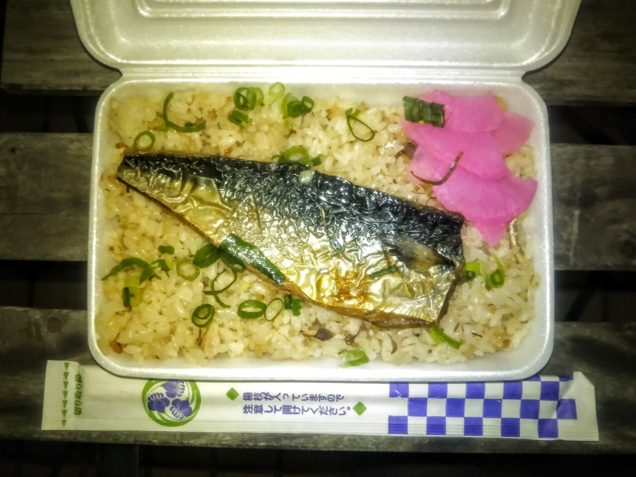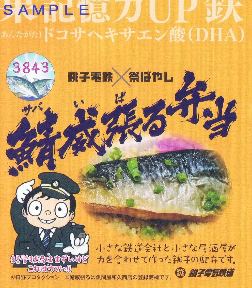 2018年10月14日より土日祝日に犬吠駅で発売開始した駅弁で税込648円。犬吠初日の出号の到着前後に犬吠駅で開催されていた『銚電 元旦犬吠朝市』にて販売。写真左は掛紙で、まずい棒キャラクター『まずえもん』のデザイン。掛紙は前年に発売1周年を記念してリニューアルされた二代目のもの。写真右は中身。鯖水煮の炊き込みご飯の上に焼き鯖が乗っています。この弁当自体とても美味しいのですが、外がもの凄く寒かったので『銚電 元旦犬吠朝市』で販売されていた『キャベツといわしのつみれ汁』にこの弁当のご飯と焼き鯖を入れてみたら温かい絶品グルメに生まれ変わりました。
