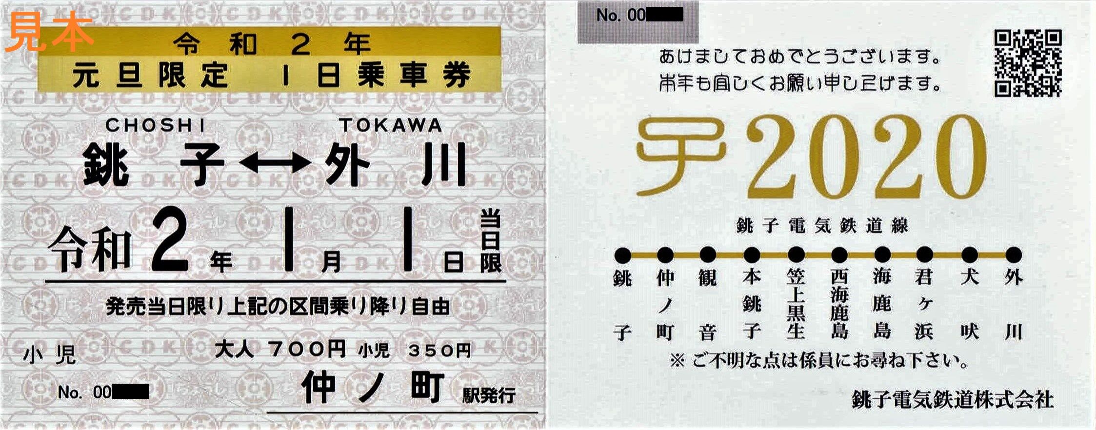 大晦日・初日の出運転時に発売された記念乗車券。当日は乗車できませんでしたが、残部が犬吠駅で販売されていました。小児断片部分には銚子⇔外川間の『澪つくし号』方向幕がデザインされていますが、裏面時刻表には銚子⇔犬吠間(犬吠初日の出号)、JR接続列車の時刻も掲載されています。《令和2年元旦限定1日乗車券(2019年12月31日〜2020年1月1日発売)》