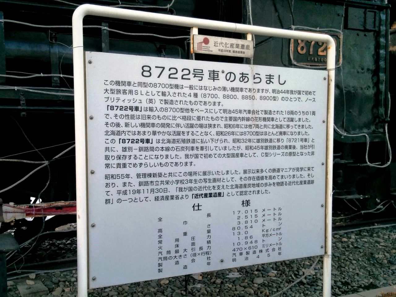 《釧路製作所に展示されている雄別鉄道・蒸気機関車8722号車》