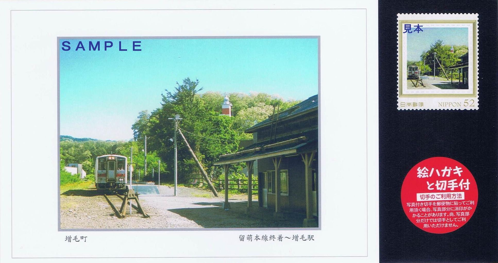 増毛駅デザインのフレーム切手1枚とポストカード1枚のセット。税込200円。――――――――――――――――――――――――――――――――――――――