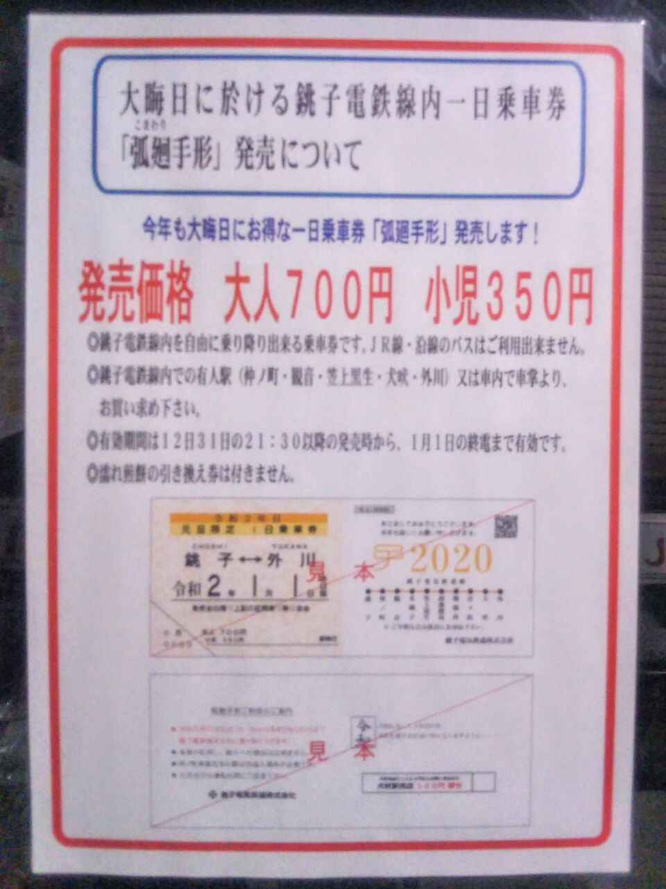 元旦1日乗車券の発売を告知するポスター。〔犬吠駅〕