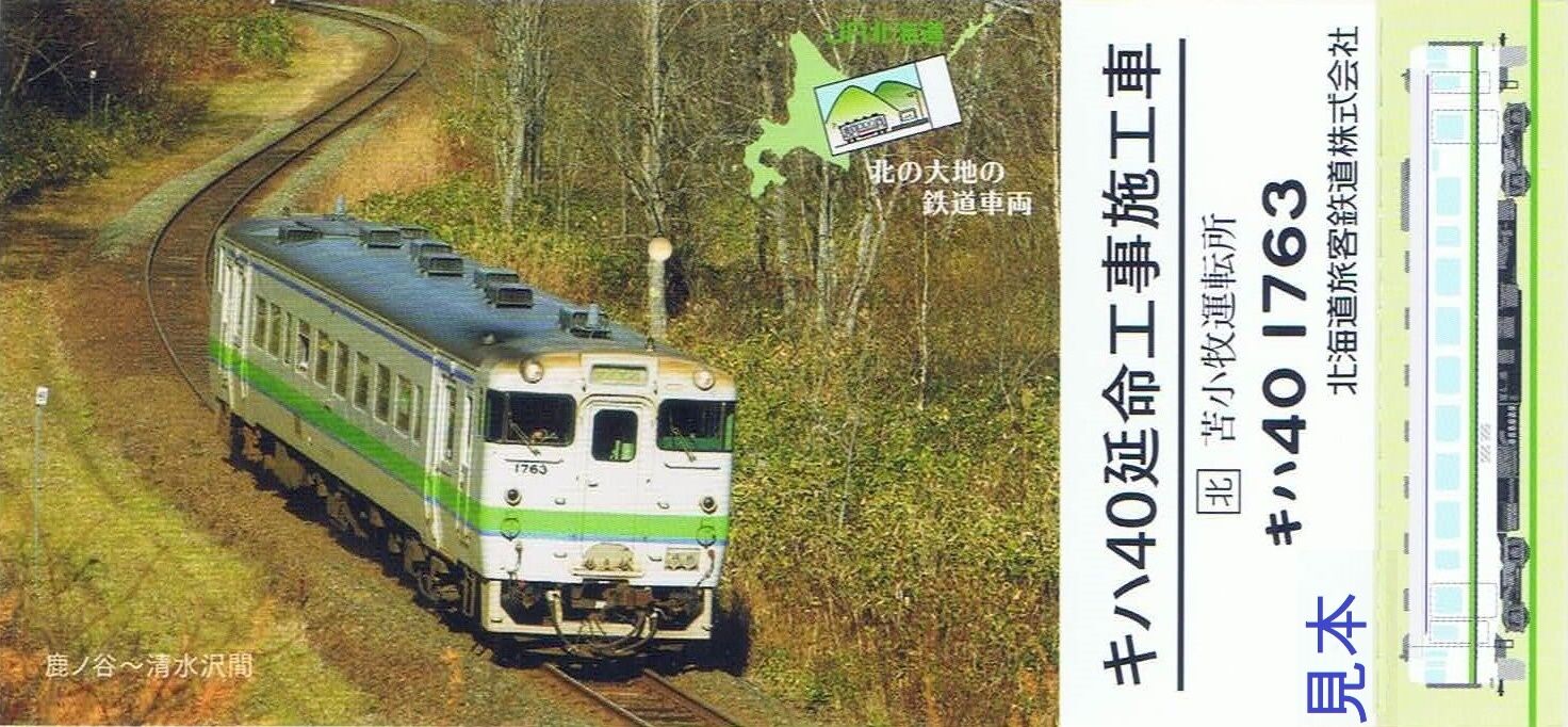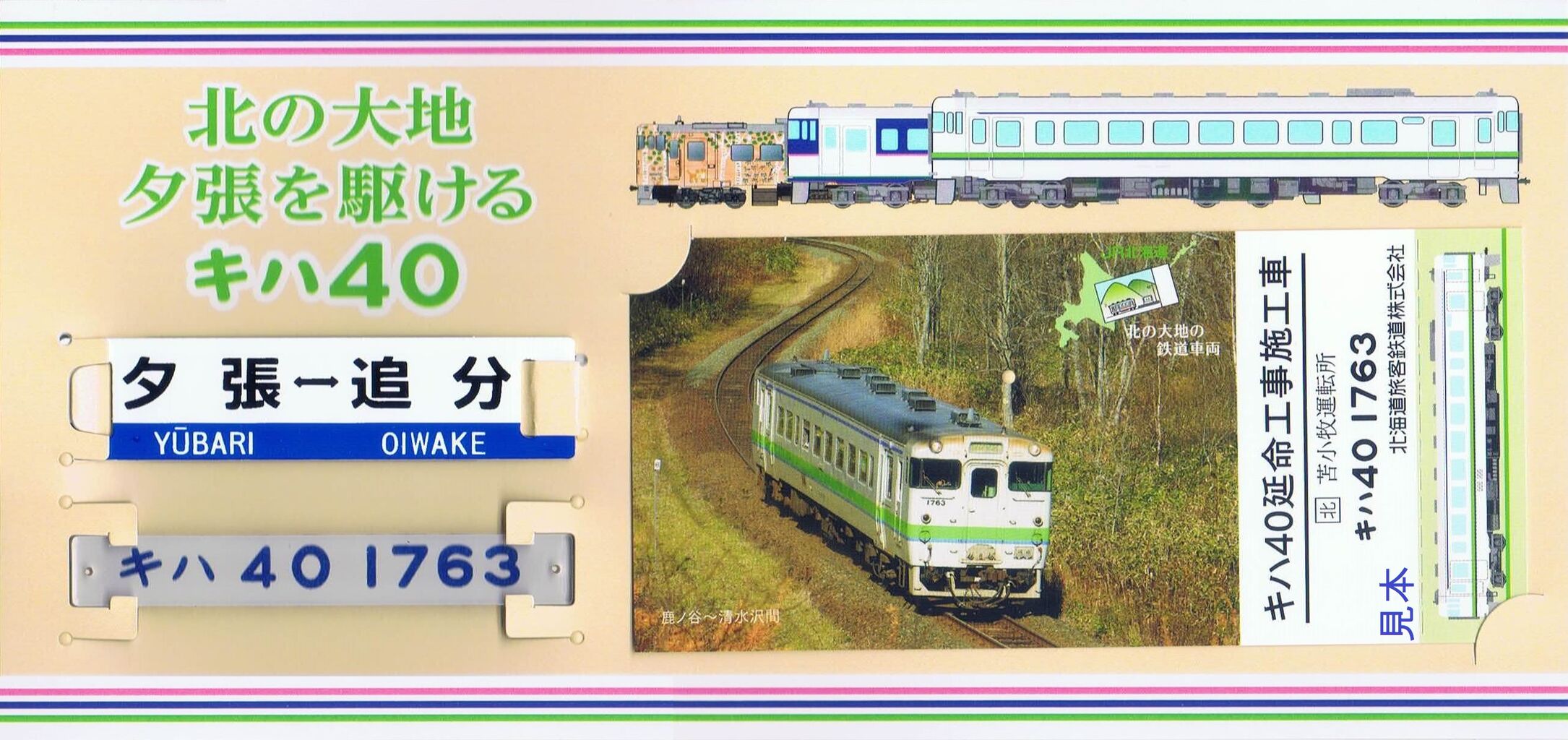 【標準色】セットのキハ40形は、キハ40延命工事施工車で苫小牧運転所の1763号車。限定カードは『わがまちご当地入場券』以降にJR北海道が発売している記念入場券と同様式。マイクロサボは原寸大の1/8サイズで表面が『夕張⇔追分』、裏面が『楓〜新夕張』。号車番号プレートは原寸大の約1/4サイズ。