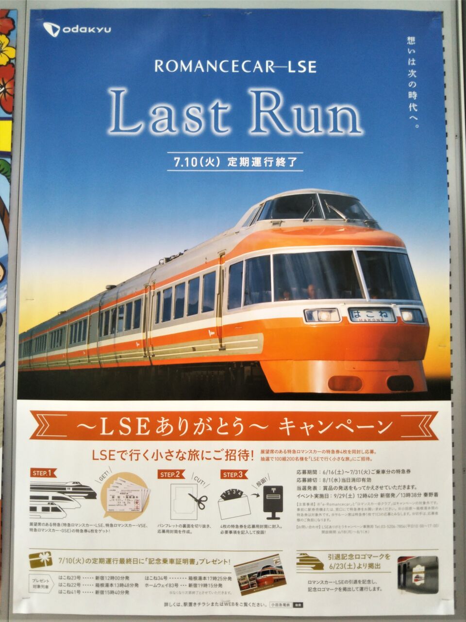 LSE定期運行最終日のはこね41号・新百合ヶ丘→小田原間に乗車。当日発車直前には既に特急券が完売となっていました。写真右は同駅に掲示されていた『〜LSEありがとう〜キャンペーン』のポスター。