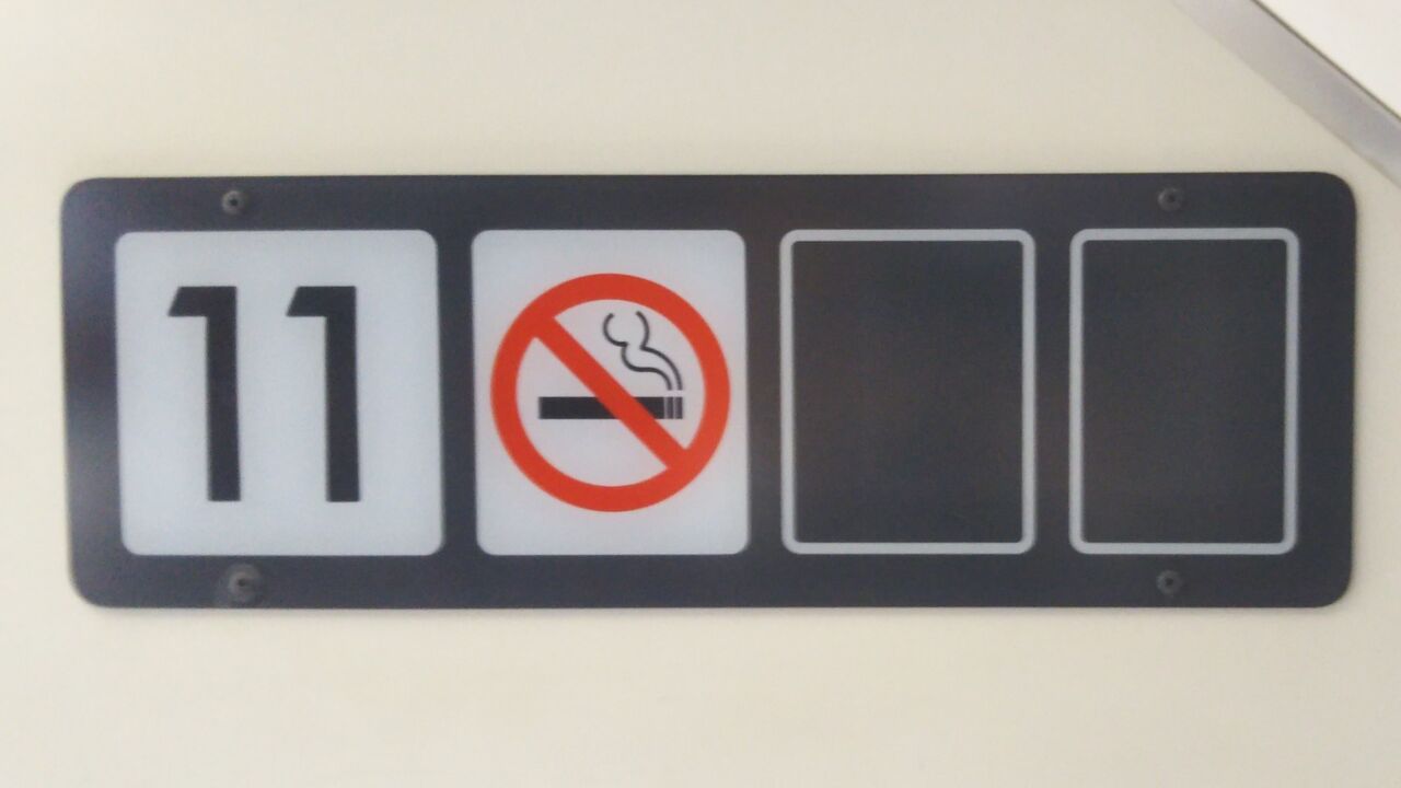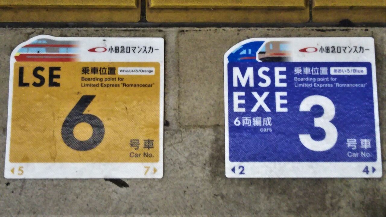 ホーム上のLSEの乗車位置案内。〔車両側面・車内〕