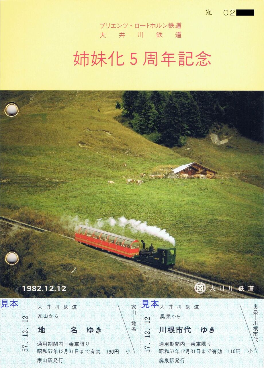 《ブリエンツ・ロートホルン鉄道 大井川鉄道姉妹化5周年記念乗車券(昭和57年12月12日)》