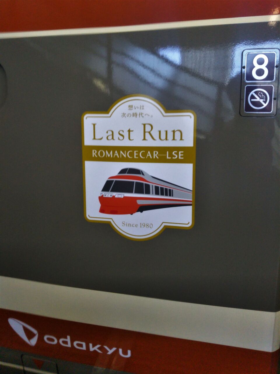 写真左はLSEありがとうキャンペーンの一環として8号車の側面に掲出されたラストラン記念ロゴマーク。ヘッドマークの掲出はありませんでした。