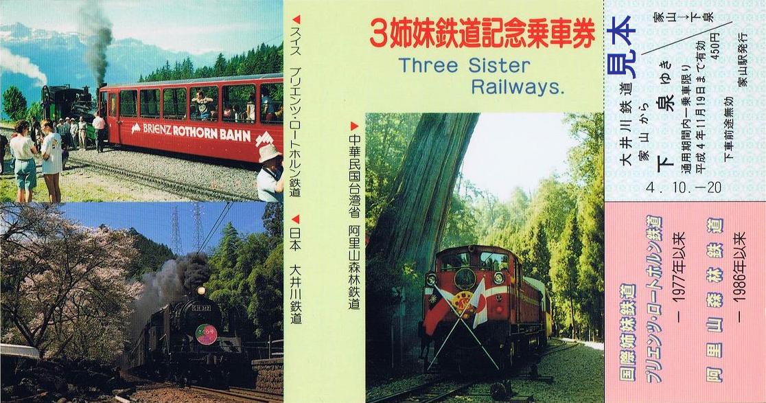 大井川鉄道とブリエンツ・ロートホルン鉄道、阿里山森林鉄道の3鉄道の写真を使用した記念乗車券。券袋等は付かず、写真の1枚のみでの販売でした。大井川鉄道の写真は桜のシーズンに運行されるヘッドマーク付きのSL急行さくら号。
