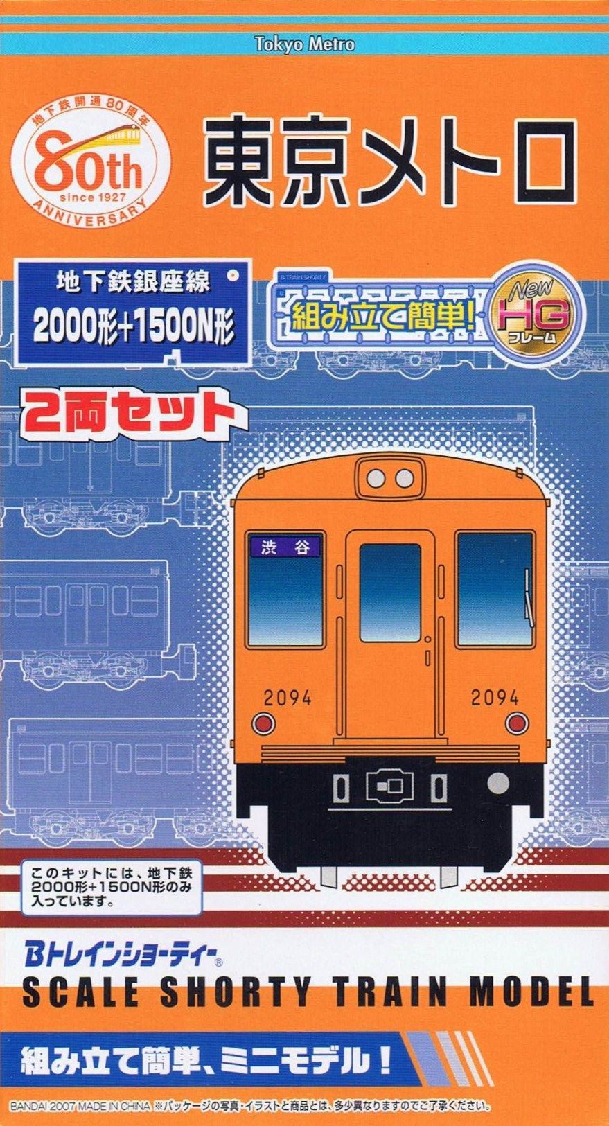 銀座線80周年記念商品で事業者限定商品。定期券発売所(9箇所)、地下鉄博物館、イベント会場等で発売された事業者限定版。屋根までオレンジ色に塗装された2000形、1500N形が各1両の計2両セット。税込1,000円。《Bトレインショーティー地下鉄銀座線6両セット(一般流通品)(平成20年1月発売)》