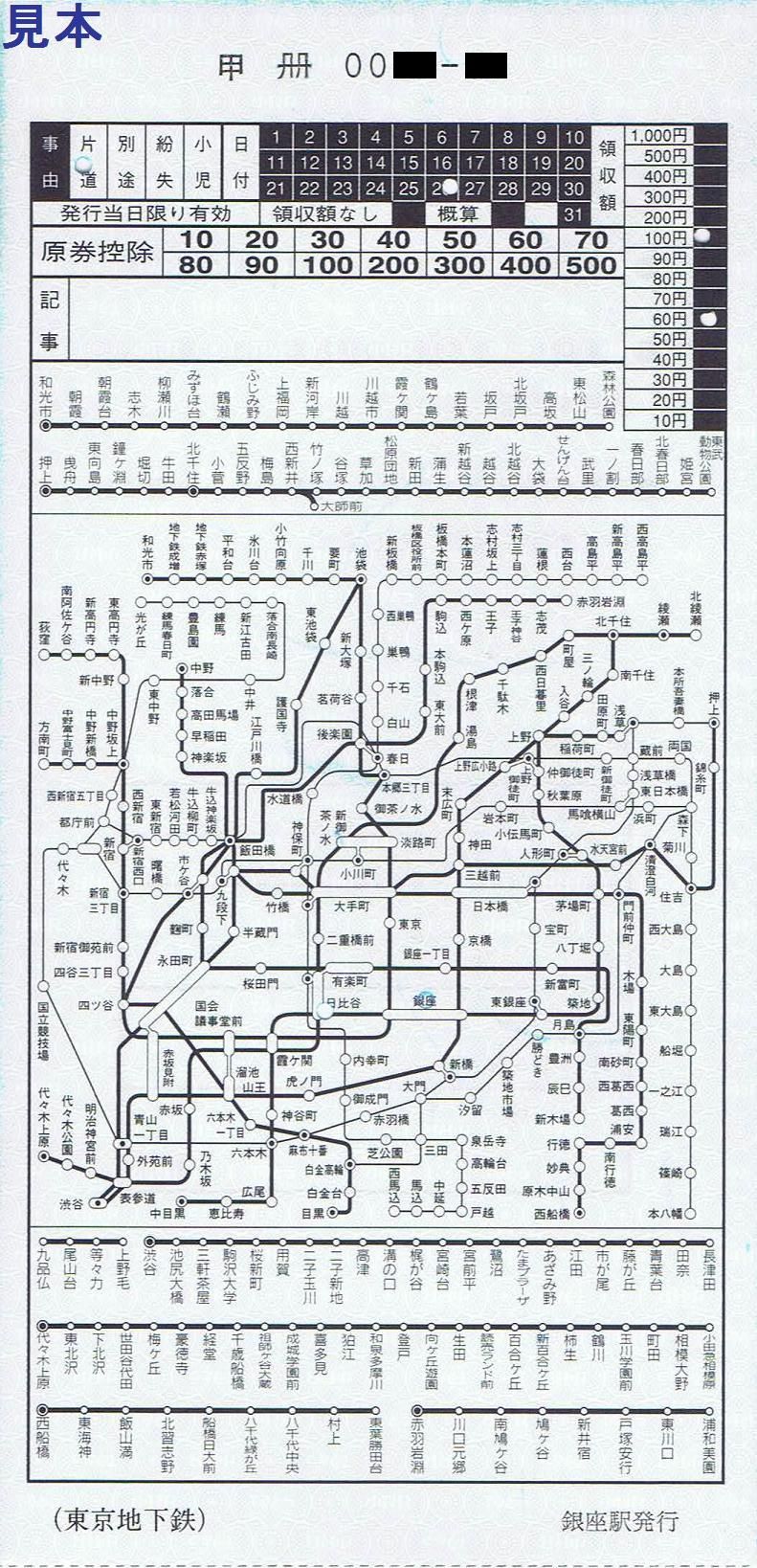 訪問日に趣味目的で発券いただけた駅の分だけ掲載致します。銀座線では銀座、日本橋、上野、浅草の4駅で購入できました。なお、副都心線開業前である相当前の発売状況ですので、現在でも同じ駅で購入可能か分かりません。