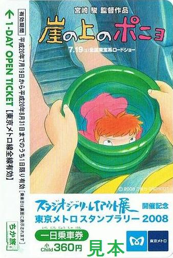 宮崎駿監督の映画『崖の上のポニョ』デザインの一日乗車券です。写真左は小児用。写真右は大人用です。