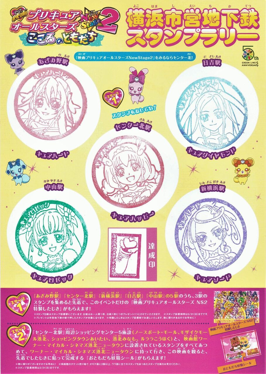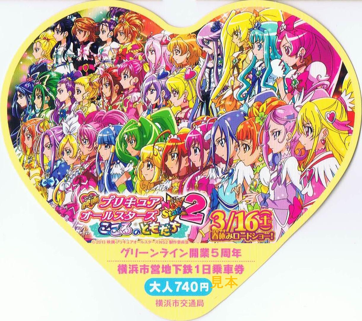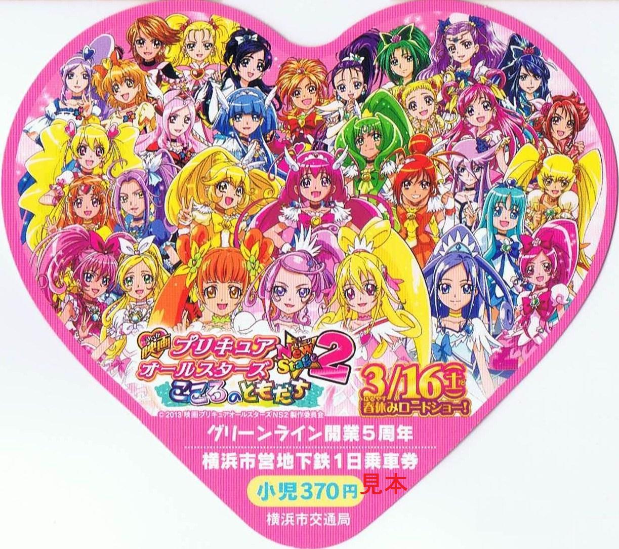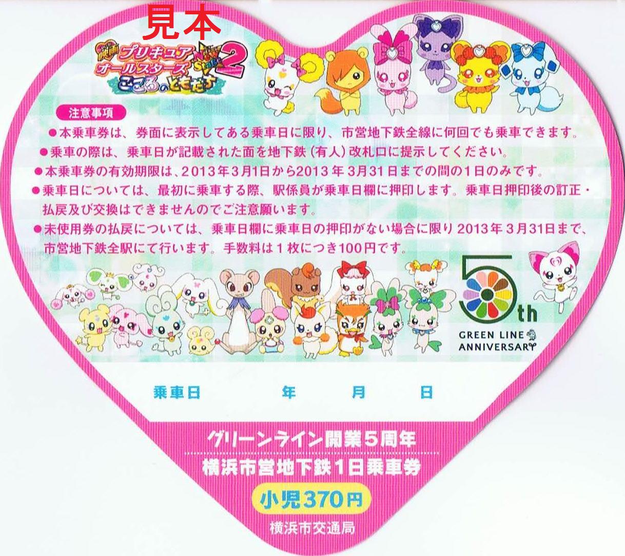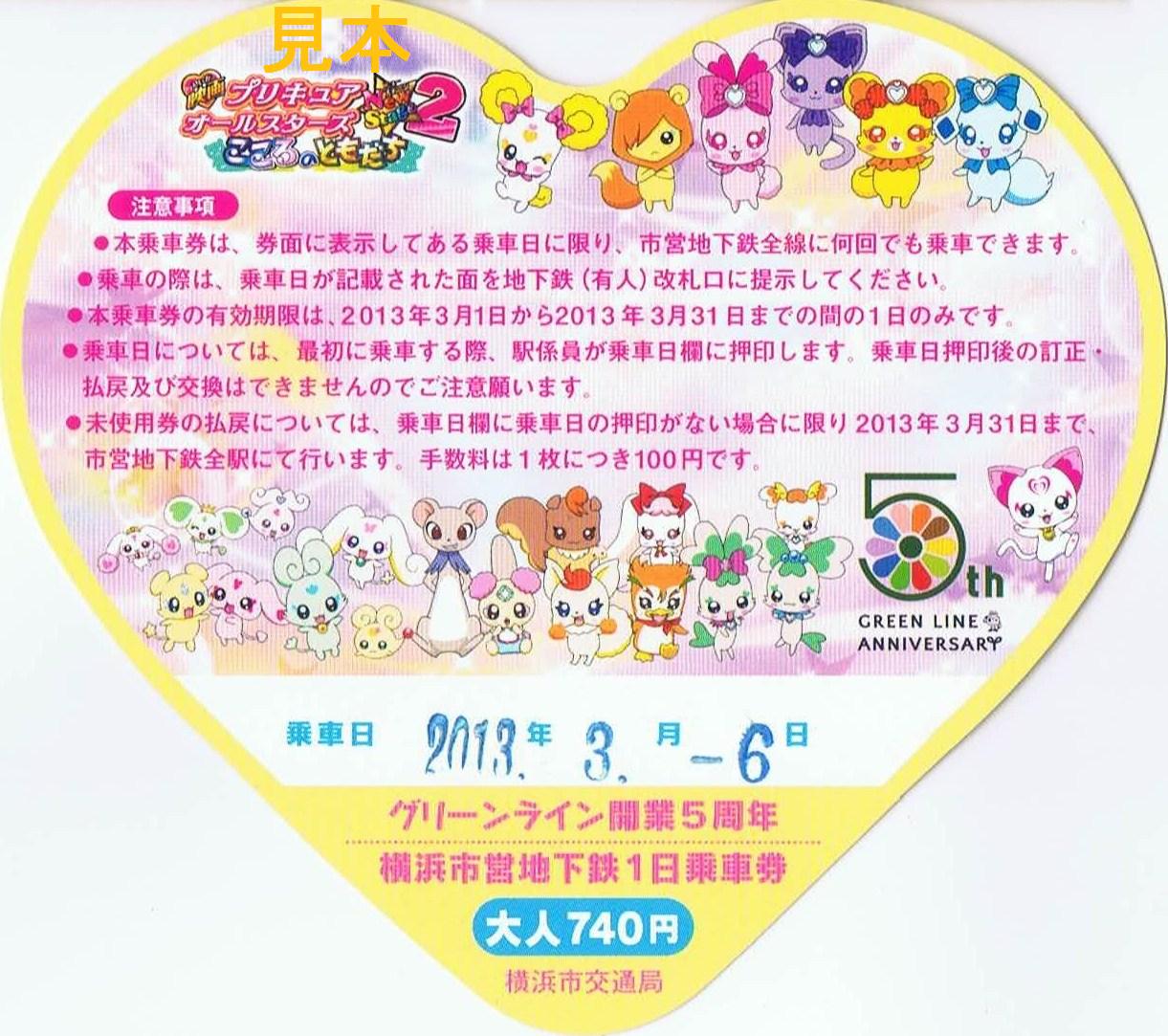 グリーンライン開業5周年事業の一環として開催された『映画プリキュアオールスターズNewStage2』公開記念横浜市営地下鉄スタンプラリー用の1日乗車券でハート型をしています。センター北駅、横浜駅、新横浜駅、あざみ野駅、日吉駅、中山駅の駅事務室で小児券500枚、大人券1,500枚の限定発売。