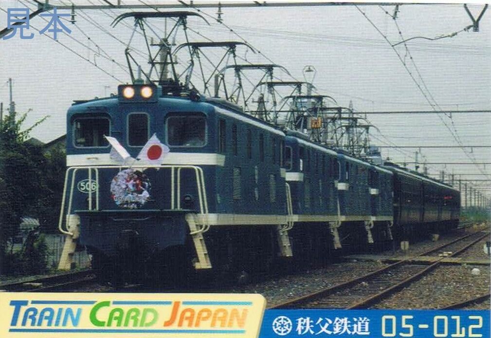 駅にて発売されたトレインカードジャパンの秩父鉄道版。紙袋に入ったブラインドパッケージでの販売。写真のものはデキ506電気機関車が牽引するEL4重連秩父川瀬祭号。※2007年10月16日掲載(H18川瀬祭乗証)