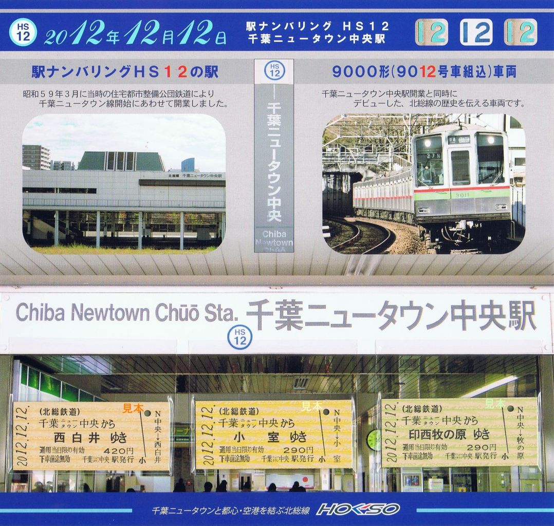 台紙のデザインは千葉ニュータウン中央駅と9012号車を含む9000形車両。千葉ニュータウン鉄道が第3種鉄道事業者の区間内にある駅で、車両も同社の所有という面白い組み合わせ。硬券はオリジナル地紋。《第20回鉄道の日記念硬券乗車券セット(平成25年10月14日発売)》