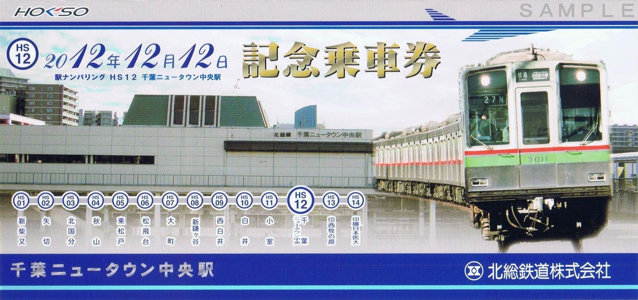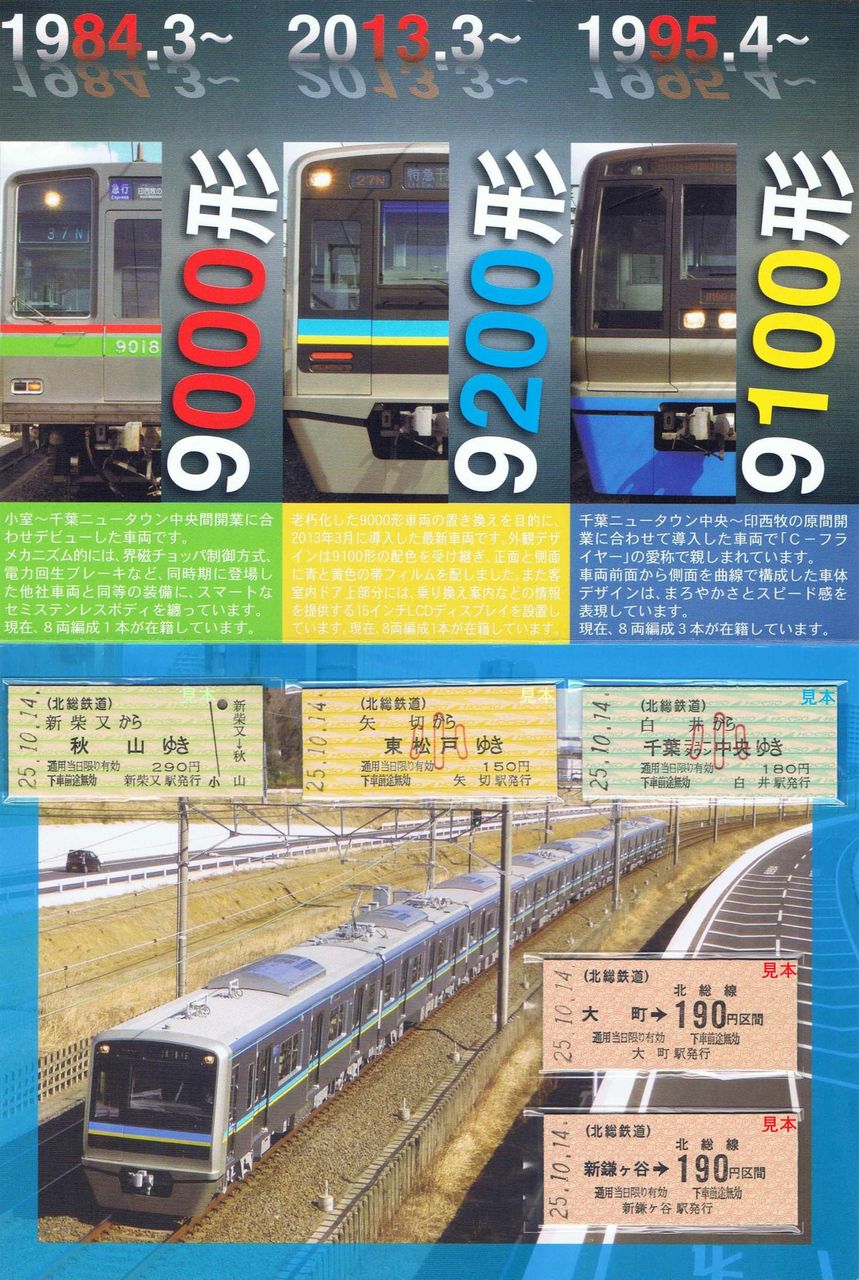 B型硬券乗車券5枚と台紙をセットにして発売。1セット1,000円で1,000セット限定。YOKOHAMAトレインフェスティバル2013で先行発売。台紙外側表面のデザインは千葉ニュータウン鉄道所有車の並び。最新形式である9200形がこの記念乗車券の主役です。各車の方向幕は特急、急行を表示。