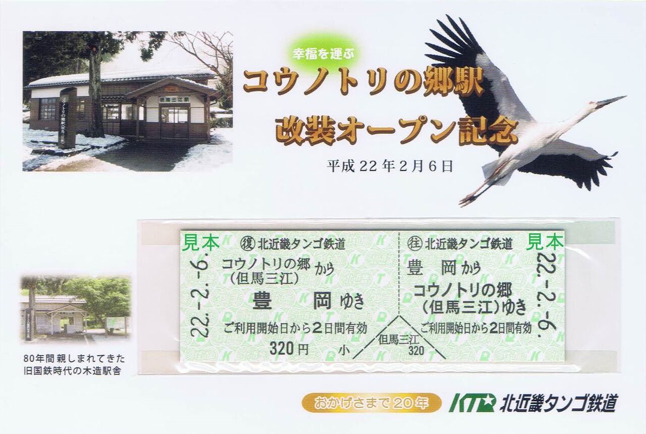 宮津線但馬三江駅(愛称・コウノトリの郷駅)の駅舎改築を記念して、豊岡〜コウノトリの郷間のD型硬券往復乗車券と台紙(写真左)、ポストカード(写真右)をセットにして発売。限定1,000セット。なお、但馬三江駅はWILLER TRAINSに移管後、コウノトリの郷駅に改称されています。【関連記事】
