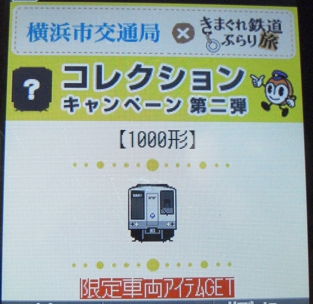 ラリー達成者が貰えるWチャンス応募用紙についているQRコードを読み取ると写真の『きまぐれ鉄道ぶらり旅限定車両アイテム1000形』がプレゼントされます。※2011年10月23日掲載(オリジナルコレクションカードNo.1)