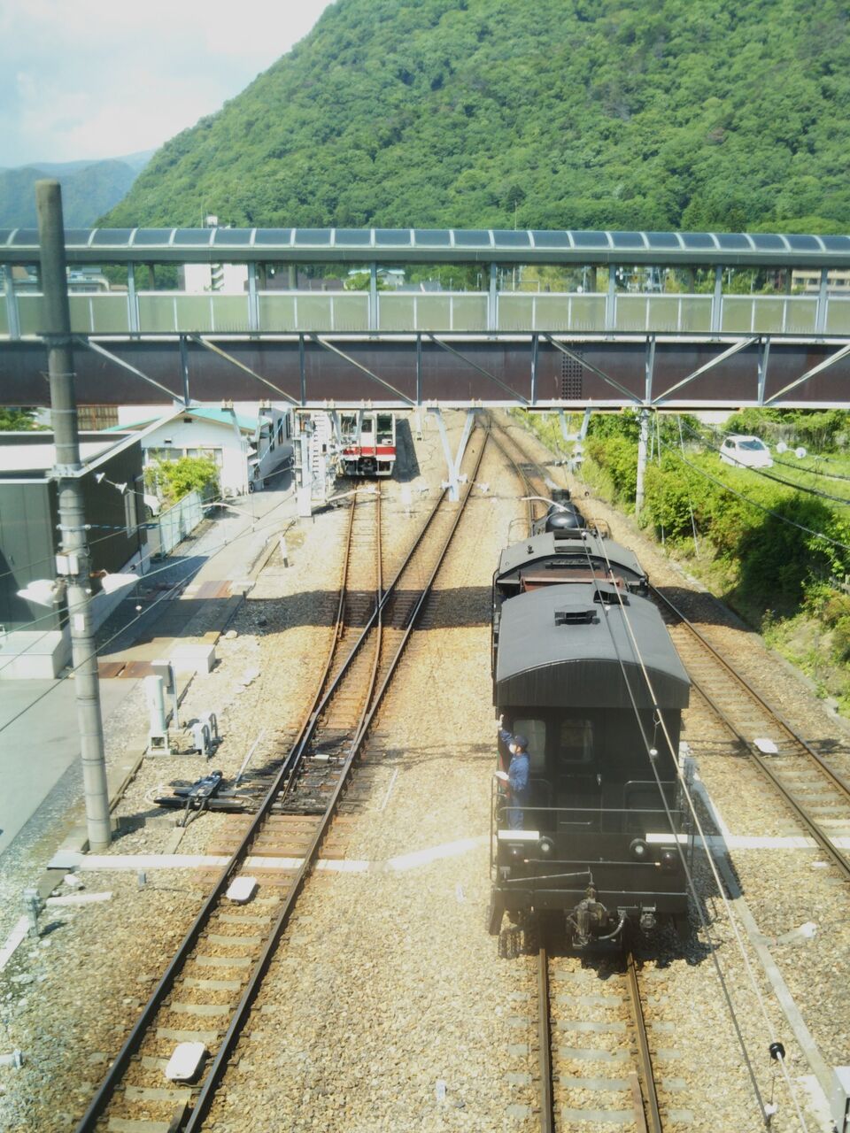 初めて大井川鉄道を旅行したときの写真です。夏休み期間中でしたが残念ながら運転日ではなく乗車できませんでした。当時の千頭駅や駅前の店や民家等は井川線とリバーサイド線に挟まれていました。当時の千頭駅舎はまだ木造の古い建物でしたが、駅舎をでて右手・堤防沿いのリバーサイド線線路上に青い客車が停められていました。