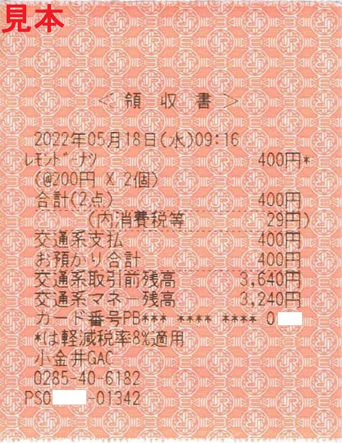 写真は東北本線区間(小金井GAC)の車内販売の領収書です。