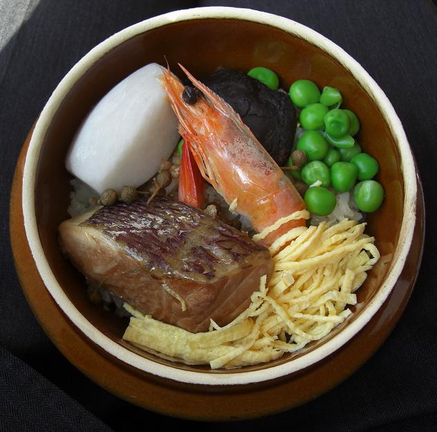 鯛がメインの釜めしで、写真を御覧の通り一見、中身はシンプルに見えるのですが、ご飯にしみ込んだ鯛の香りが絶品。