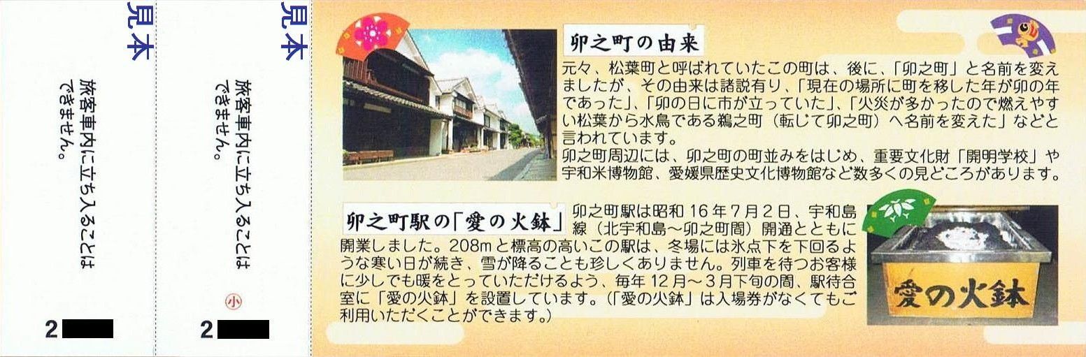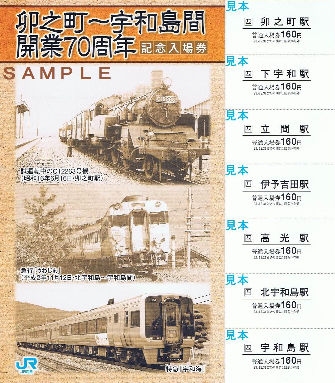 開業70周年を迎えた卯之町〜宇和島間各駅の入場券を1枚のシート状にしたもので限定3,000枚発行。図柄はC12形蒸気機関車、急行うわじま、特急宇和海。――――――――――――――――――――――――――――――――――――――