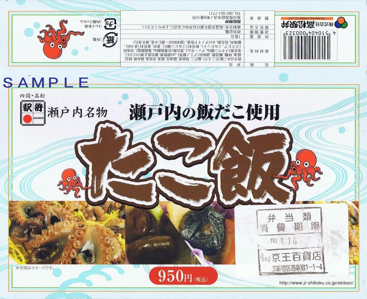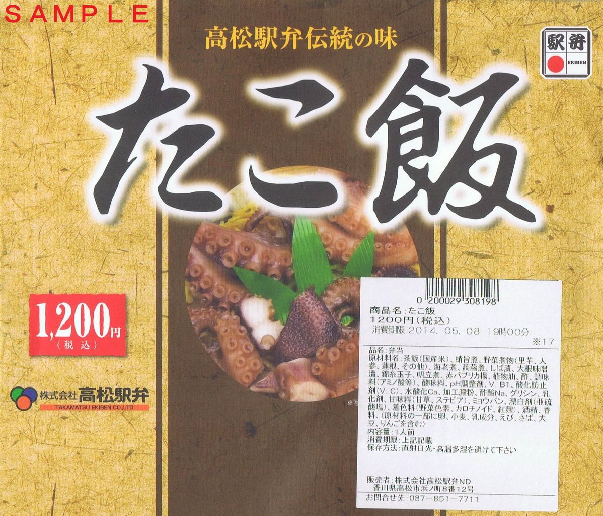 たこ飯の現行商品で税込1,200円。東京駅構内の駅弁屋祭で購入。調製元の高松駅弁は平成26年9月で解散の予定。今後、この弁当の販売を引き継ぐ業者等は未定。