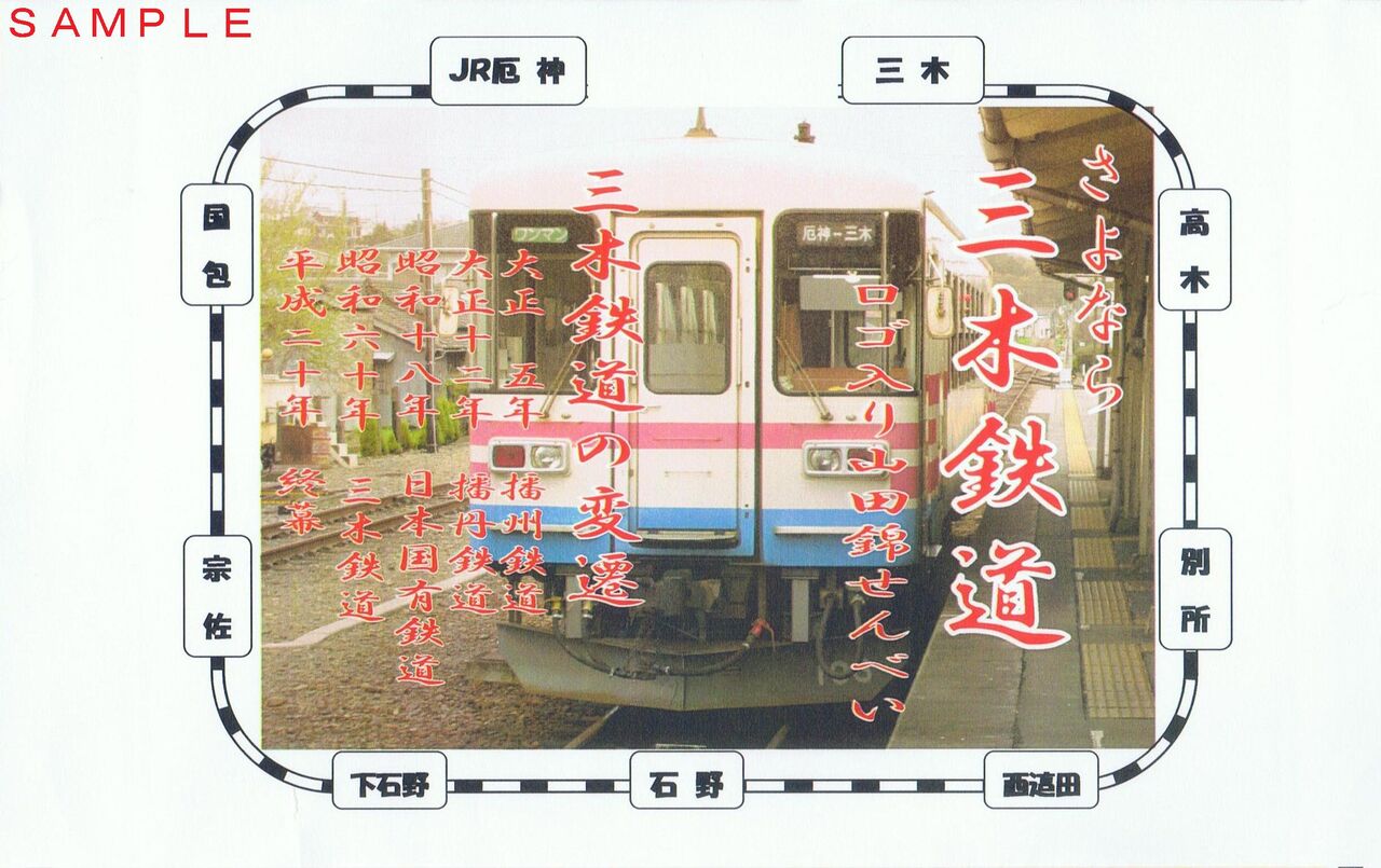 廃止が具体化した頃から発売開始したものだと思います。三木駅窓口で購入。写真左は掛紙。車両ではなく車紋入りなのがシブめ。箱に入っており、その中にせんべいと写真左下の紙が入っており、『ありがとうございます』と書かれています。こういう演出は個人的に大好きです。
