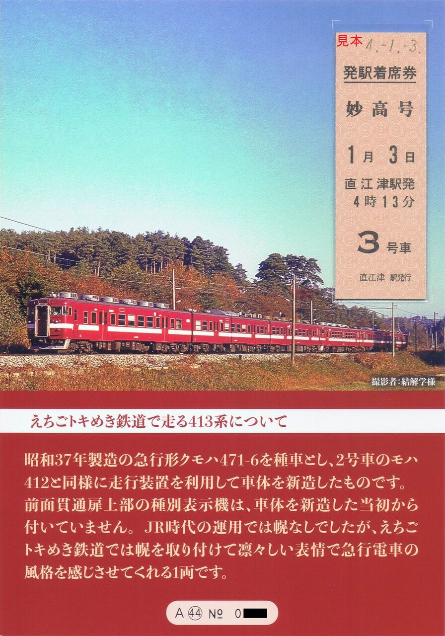 D型硬券乗車券・急行券1枚+D型レプリカ硬券と専用記念台紙のセット。AタイプとBタイプの2種類があり、1セット各1,500円。各500セット限定。写真はAタイプで左は台紙表面。右は裏面。台紙のデザインはデビュー当時の413系。レプリカ硬券は直江津駅発行の妙高号発駅着席券。券面に日付、発車時刻、号車が記載されています。【関連記事】