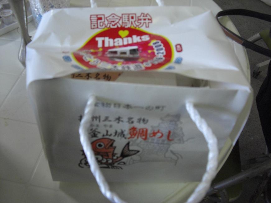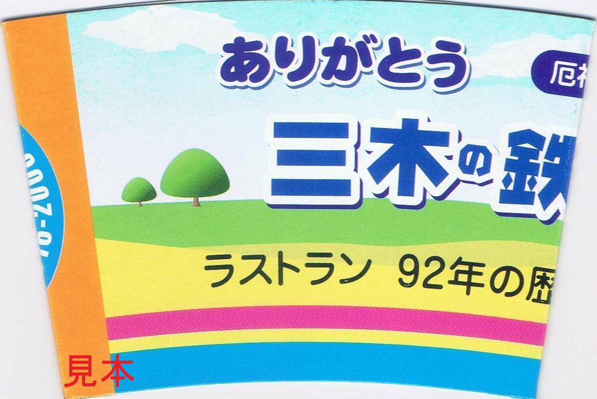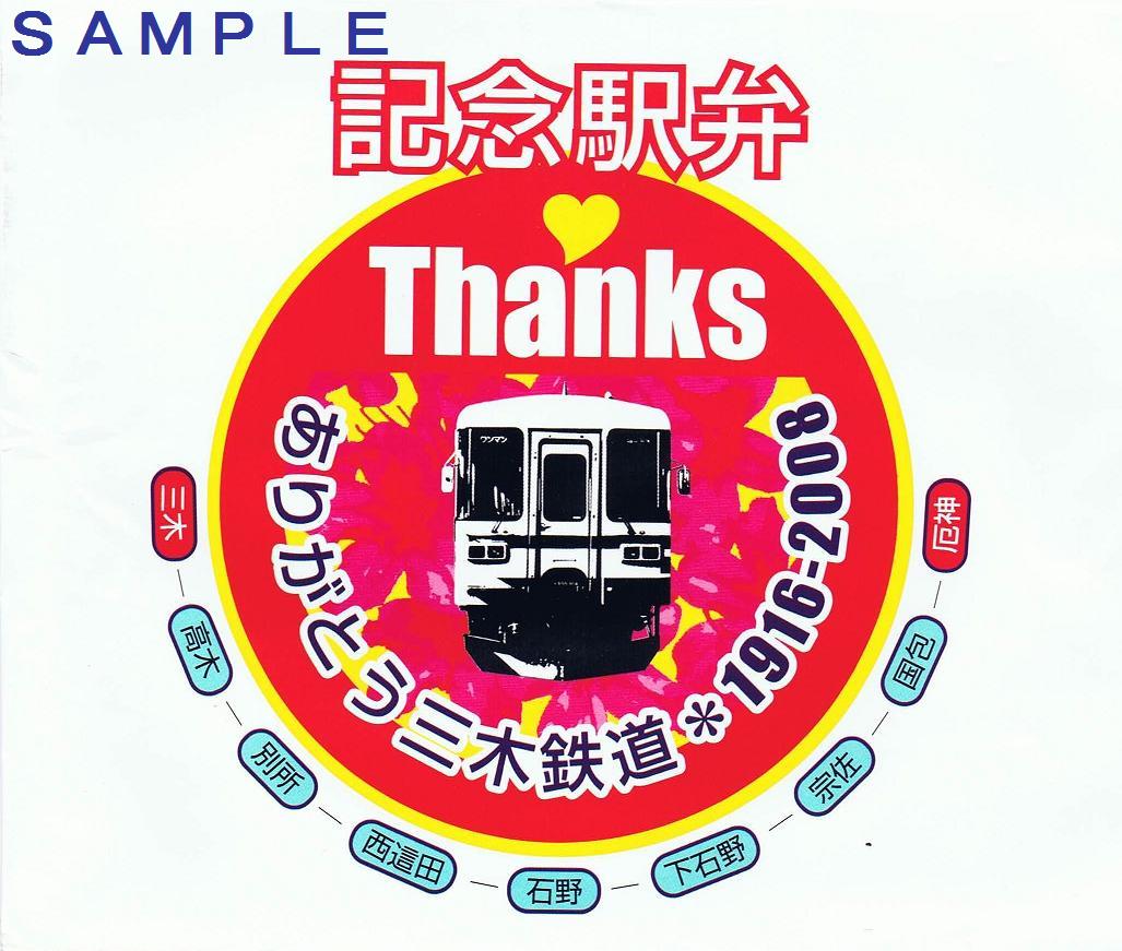 平成20年3月1日の廃止記念イベント開催にあわせ、三木駅イベント会場で記念駅弁が発売されました。イベント開始時点(10時)の種類は3種類ありましたが、その後、更に何種類か発売されたようです。私は2種類食べています。なお、記念駅弁オリジナル掛紙は各種共通のようで、写真左のものが使用されていました。廃止記念ヘッドマークのデザインです。