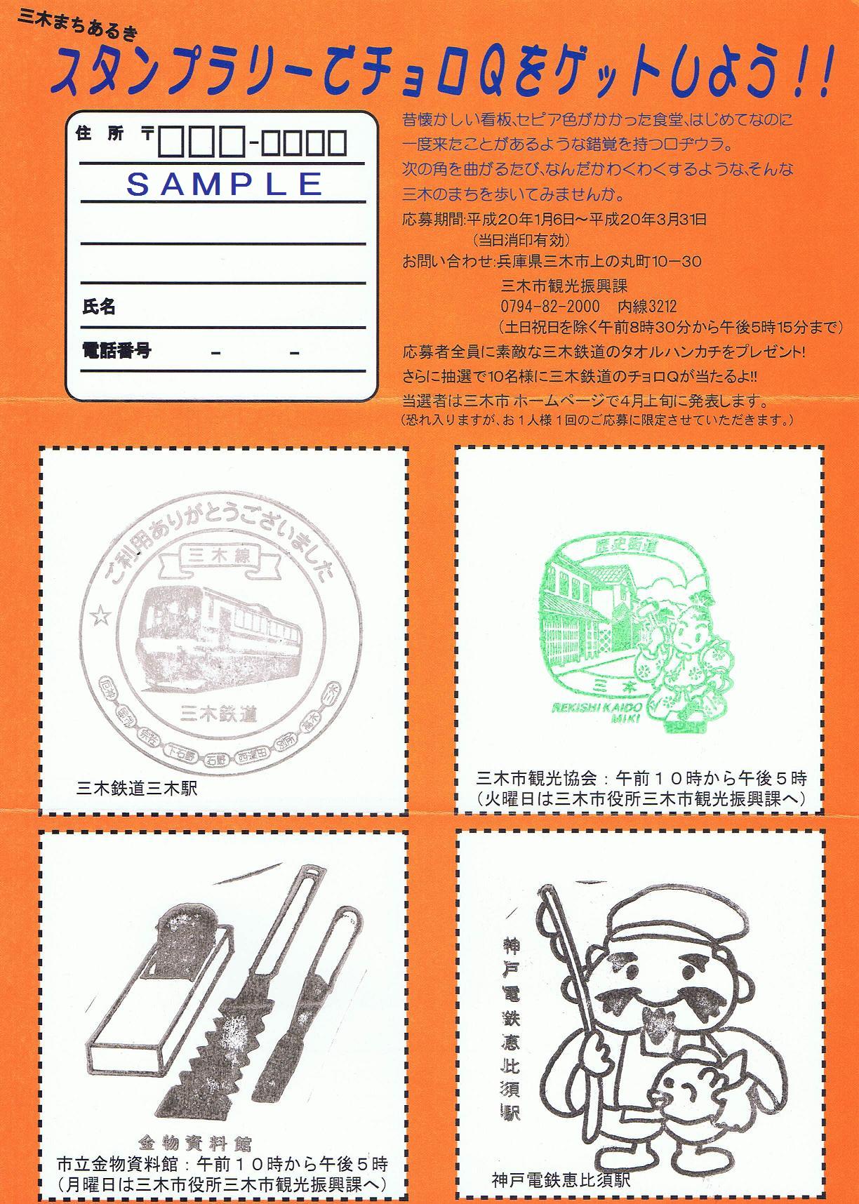 三木鉄道三木駅、神戸電鉄恵比須駅、三木市観光協会、三木市立金物資料館の4箇所を廻り、応募すると抽選で三木鉄道チョロQが当たるという内容。三木鉄道廃止後、神戸電鉄恵比須駅は、神姫バス運行の三木鉄道代替バス終点となりました。