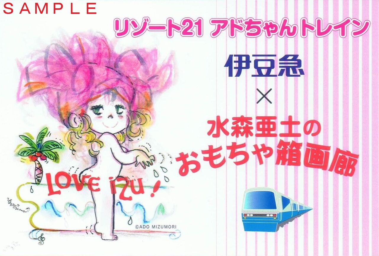 伊豆急行は2016年7月16日〜8月17日、水森亜土さんとコラボレーションした『リゾート21アドちゃんトレイン』を運行しました。運行区間は熱海〜伊東〜伊豆急下田間(JR東日本伊東線・伊豆急行線)。使用車両は『リゾートドルフィン号』で、ヘッドマーク装着と水森亜土さんのイラストのラッピングが施されていました。