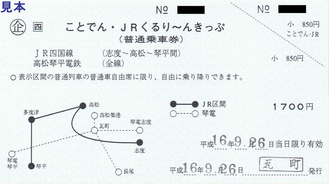 高松琴平電気鉄道とJR四国が共同で発行する企画乗車券で、高松琴平電気鉄道全線とJR四国予讃線高松〜多度津・土讃線多度津〜琴平・高徳線高松〜志度間が有効区間。写真は高松琴平電気鉄道の駅で発売されている常備券で瓦町駅で購入したもの。JR-S・青色地紋。当時は大人用1,700円(現在は1,900円)です。