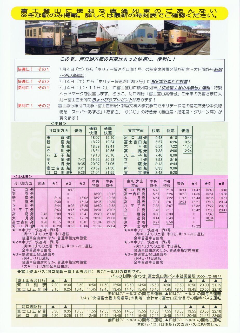 富士急行線・富士登山バスの運賃がセットになった企画乗車券のチラシでA4サイズ・両面印刷。裏面(写真右)には富士登山に便利な直通列車として、ホリデー快速河口湖号以外に普通列車、快速列車、通勤快速、中央特快、富士登山高嶺号の時刻表が掲載されています。======================================