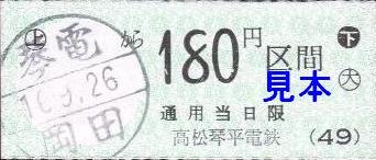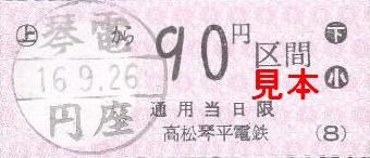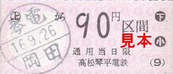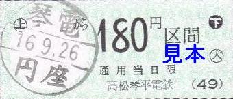 平成16年9月26日当時の琴平線内では、円座駅、岡田駅で販売されていました。各駅の小児用90円券と大人用180円券を入手しました。発行日・発行駅名は丸型のスタンプが押されます。